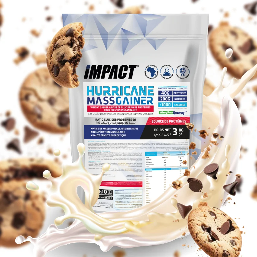 HURRICANE MASS GAINER est un gainer haute performance spécialement conçu pour soutenir les programmes de prise de masse musculaire exigeants. Sa formule hypercalorique repose sur une forte concentration de glucides complexes (dont la maltodextrine à haute digestibilité) associée à un mélange de protéines WheyPeaSynergy, offrant un profil complet en acides aminés essentiels.