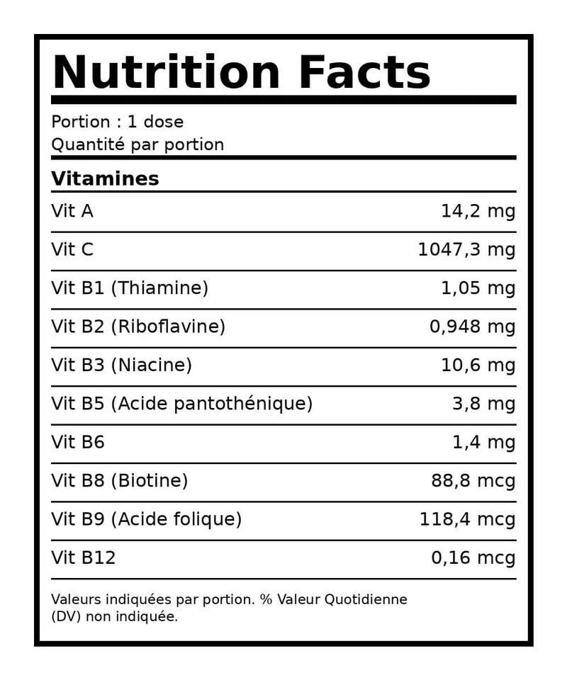 Énergie & Santé : L'ajout de Vitamines B, C et de minéraux soutient votre métabolisme énergétique pour une performance durable et un système immunitaire renforcé.