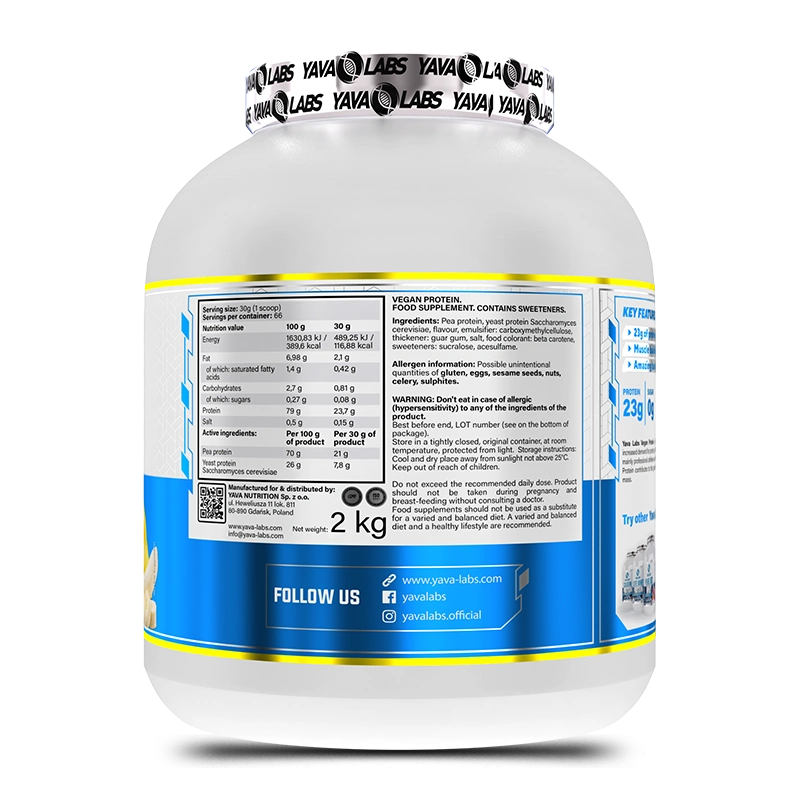 La Yava Labs Vegan Protein est une révolution pour les athlètes vegans et les personnes intolérantes au lactose. Sa force réside dans son mélange unique de protéines de pois et de protéines de levure, offrant un profil complet en acides aminés pour stimuler la croissance musculaire et accélérer la récupération.